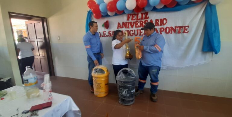 La unidad educativa San Miguel Aponte ubicada en la Comunidad San Miguel de los Junos, en el Distrito 14, este miércoles cumplió 59 años de fundación, y por ello, la Empresa Municipal de Aseo Urbano de Santa Cruz (Emacruz) entregó trofeos y medallas para que sean parte de los premios que otorgue la unidad educativa en su campeonato de fútbol que finaliza este fin de semana, actividad que se lleva adelante en el marco de su aniversario.